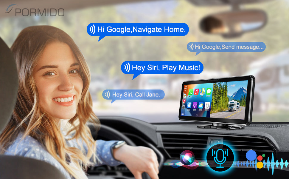 PORMIDO 10.26" Portable Carplay Dash Cam Touchscreen for Apple Android Wireless Car Play Detached Front and Rear HD1080P Backup Camera with Voice Control,Bluetooth,Navigation,Stream Record 64GB Card